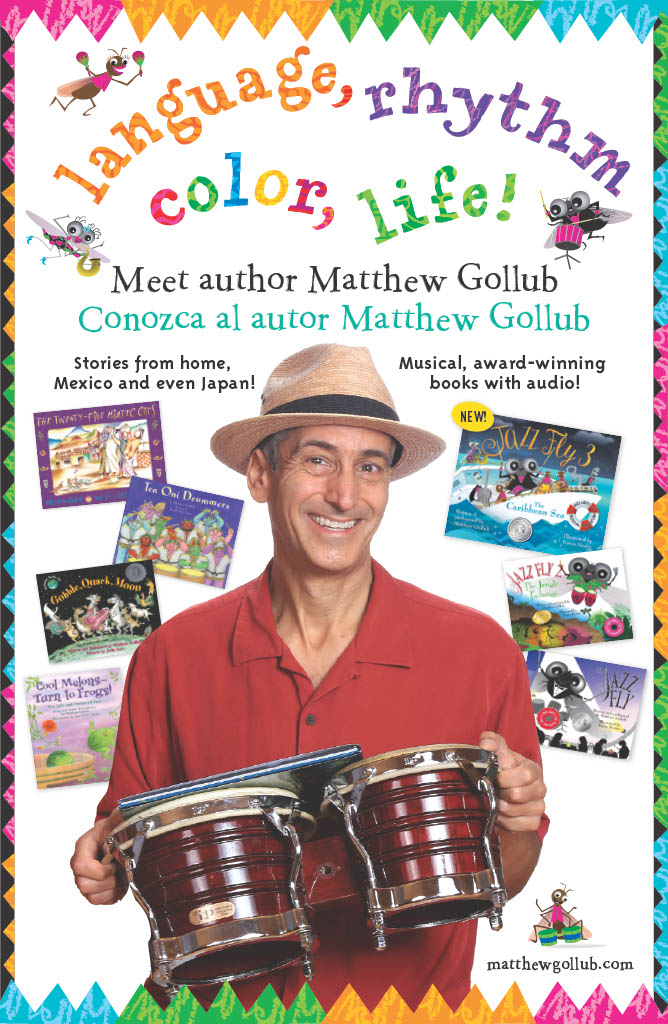 Matthew Gollub is an internationally-known children’s author who has performed at over 1,000 schools. A dynamic drummer and bilingual (English / Spanish) presenter, he inspires students and teachers to bring stories to life. His 20 picture books have garnered dozens of awards and distinctions. While his musical narrations accompany some of his most popular books, including The Jazz Fly series, he also has written traditional picture books set in Mexico and Japan where he has lived. He lives with his family in Santa Rosa, California, north of the Golden Gate Bridge.